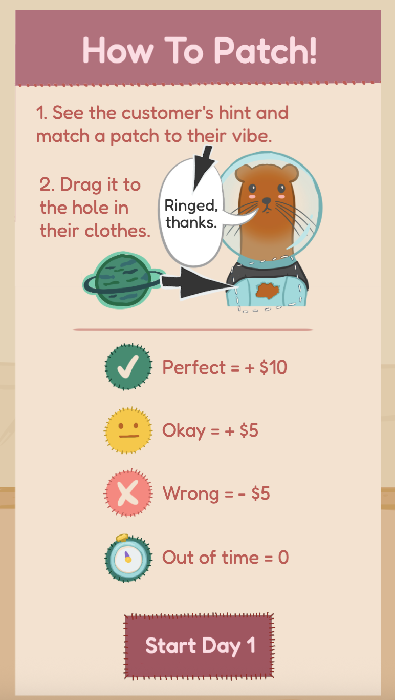 The Patchshop is a short, quirky game where you run a lil' patch shop for animal customers with big personalities. Each visitor comes in with a clue about what patch they want. You’ll need to read between the lines, pick the patch that matches, and keep your customers happy.